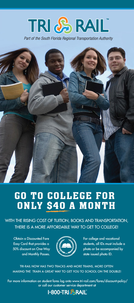 Designed to promote discounted Tri-Rail fares for students when they register for an EasyCard. The rack card targets millenials primarily and promotes the train as a viable alternative to driving to school for their daily commute.